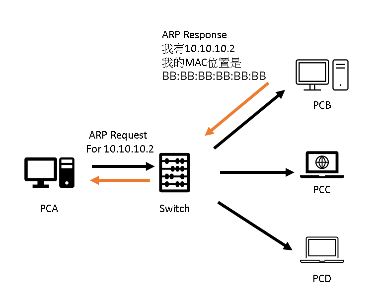 當PCB收到該ARP Request並確認自己為該目標IP的持有者後,會回傳一個ARP Reply,告知PCA,其MAC位址BB:BB:BB:BB:BB:BB,其運作流程如圖2所示。
