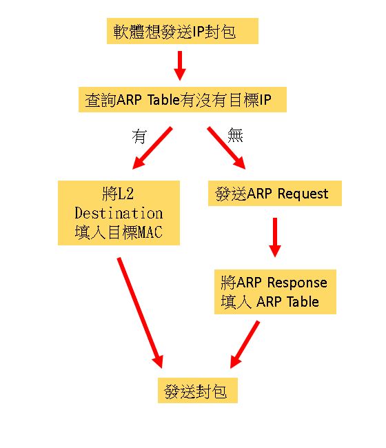 在對ARP通訊協定和其運作原理有基本的認識之後,接著說明什麼是ARP Table。在前面提及終端設備上的應用基本上都是使用IP來作為發送與接收的依據,但不可能每傳送一次IP封包都需要發送一次ARP封包來解析MAC Address,這樣會造成太多不必要的流量產生,因此終端設備都會自己維護一張表,來暫存這些獲得的ARP Response。若想查詢電腦上目前暫存的位置對應表,可使用指令「arp -a」來查詢。一般來說,整個流程大概如圖3所示。