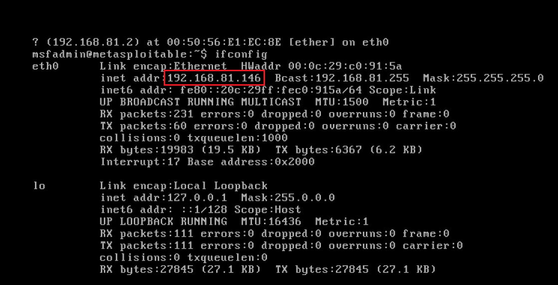 為了方便自行操作,同時避免攻擊到其他實際在運作的交換器而觸犯《妨害電腦使用罪》,以下使用Metasploitable2來模擬皮妥宿舍裡的老舊交換器,先在虛擬機上啟動Metasploitable2(帳號和密碼皆為msfadmin),接著使用ifconfig指令得知Metasploitable2的inet addr是192.168.81.146,然後開啟Kali Linux(其帳號密碼皆為kali)的Terminal輸入「ping 192.168.81.146」以確保Kali Linux與Metasploitable2可以互通(從圖5可以看出當Kali Linux在ping Metasploitable2時,封包能確實傳送與接收),其操作步驟如圖4與圖5所示。