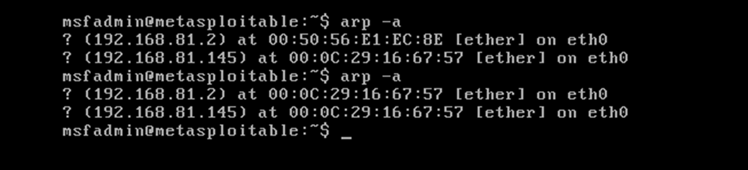 安裝dsniff套件後,接著在Metasploitable2輸入「arp -a」指令以查詢目前Metasploitable2靶機(以下簡稱Meta靶機)目前存取的ARP Table。