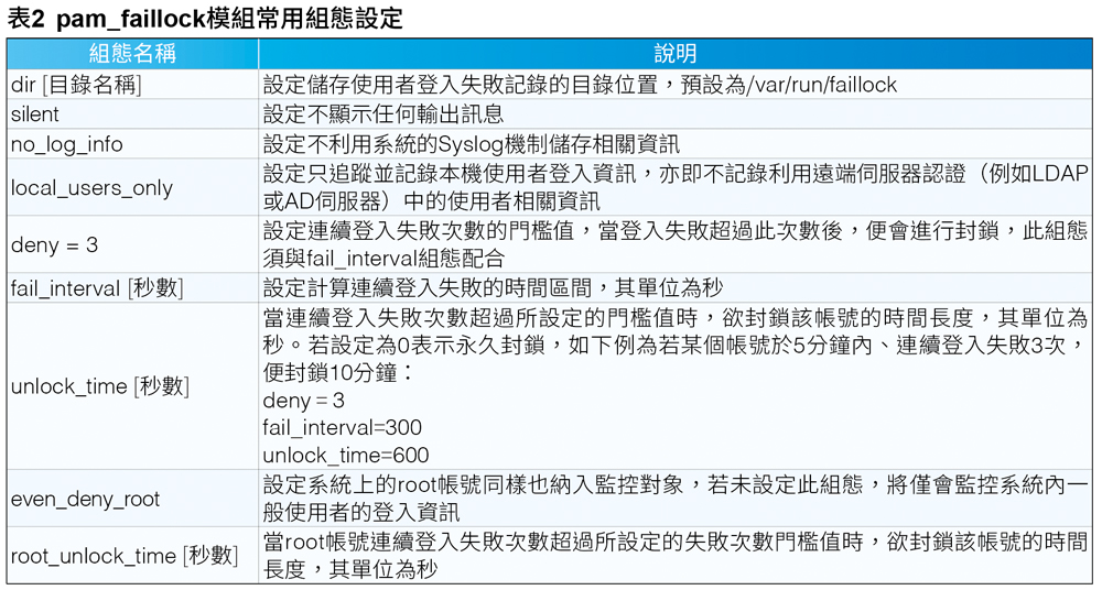 pam_faillock是PAM架構內建防止暴力破解(Brute-force Attack)的安全模組,提供管理者設定時間區間(例如5分鐘內),連續輸入密碼錯誤次數(例如3次),暫時封鎖時間(例如封鎖1分鐘)等組態,例如管理者可設定在5分鐘內連續輸入超過3次的錯誤帳號就封鎖該來源1分鐘,藉此來防止攻擊者的暴力破解攻擊。其所使用的組態檔為「/etc/security/faillock.conf」,常用的組態設定如表2所示。