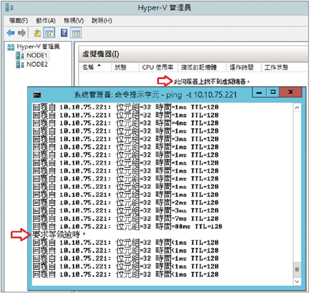 當來源端Hyper-V主機(Node 1)傳送完VM虛擬主機記憶體狀態時,在切換到目的端Hyper-V主機(Node 2)的「瞬間」,將會看到外部主機對VM虛擬主機的持續ping封包掉了「001個」,這是因為VM虛擬主機遷移到不同的Host主機(MAC Address不同),因此交換器需要更新其MAC Address Tables所導致(圖18)。