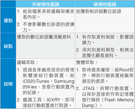 鑑識方法中有兩種態樣作法,包括「非破壞性鑑識」與「破壞性鑑識」,從表1中可以看出,破壞性的萃取方法,有可能會存取到原始資料,影響到證據力,但卻可獲取較詳盡的資料,而邏輯性萃取則恰巧相反。