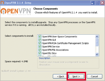 本文以Windows為Client,接下來須安裝OpenVPN Client軟體。OpenVPN Client軟體的下載網址為「http://swupdate.openvpn.net/community/releases/openvpn-2.1.4-install.exe」,目前較穩定版本是openvpn-2.1.4.install.exe,安裝過程如下圖所示,依序按下〔Next〕、〔I Agree〕、〔Install〕和〔繼續安裝〕等按鈕。
