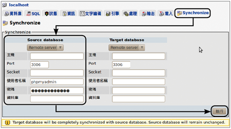 另一種備份方式則是透過兩台主機資料庫同步的方法來完成。如圖33所示,先切換至〔Synchronize〕活頁標籤內,再分別設定來源主機的位址、通訊埠、使用者名稱、密碼以及ownCloud資料庫名稱,最後按下〔執行〕按鈕即可完成異機備份。