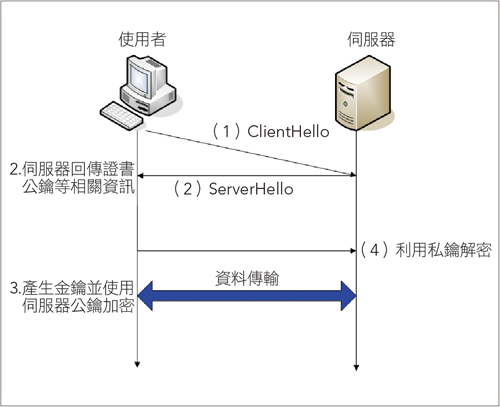 (3) SSL伺服器將利用Certificate訊息將本身公鑰的數位憑證傳給SSL用戶端。