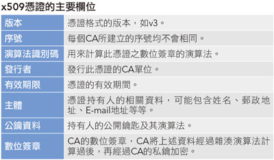 其中,Root CA(在微軟系統的IE8稱為「根憑證授權單位」,讀者可看到IE8已經預設許多根憑證授權單位)授權給CA(在微軟系統的IE8稱為「中繼憑證授權單位」),然後使用者再至認證中心註冊來取得可證明身分的憑證,x509憑證主要的欄位內容如下: