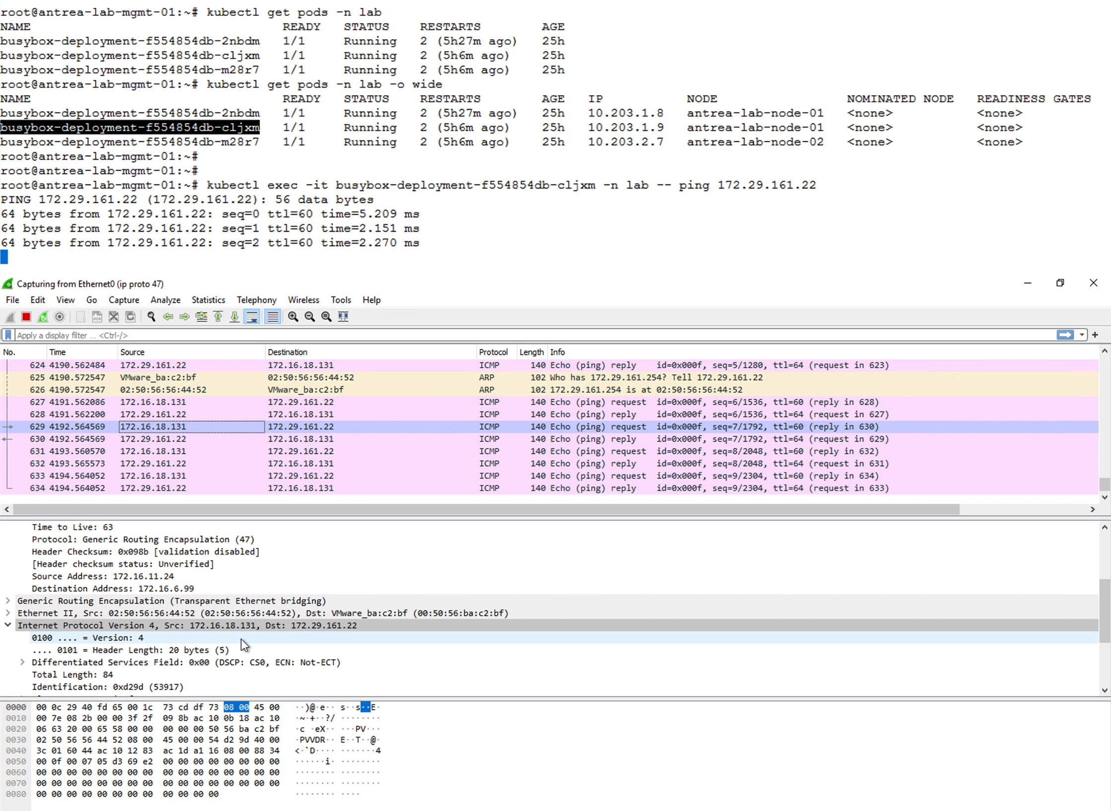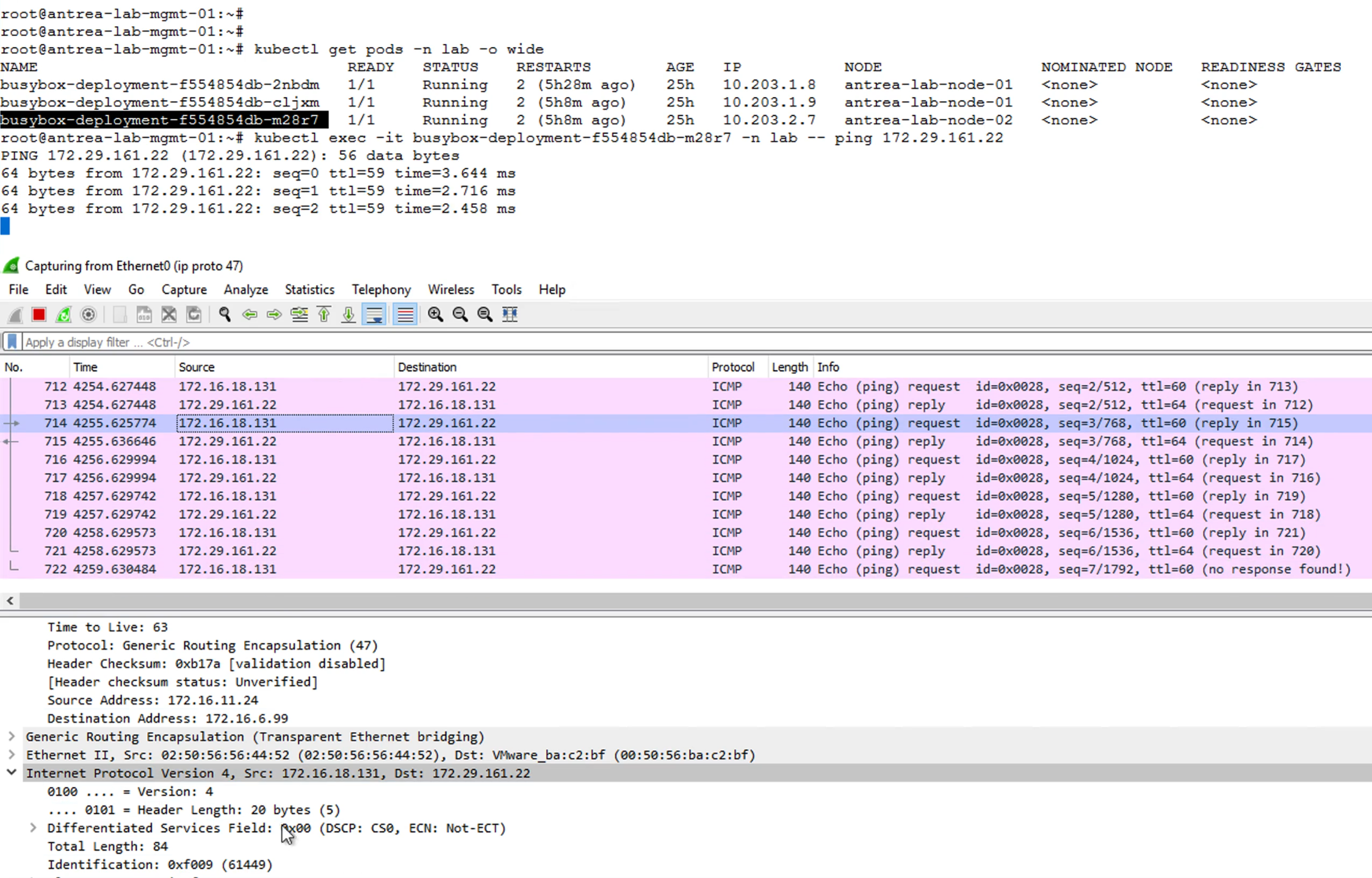 接下來,透過同樣在lab namespace內,另一個位於node-02上的pod busybox-deployment-f554854db-m28r7,IP是10.203.2.7。一樣由這個Pod去ping相同的資料庫172.29.161.22,在Wireshark看到這些ping網路流仍然是來自172.16.18.131,如圖4所示。