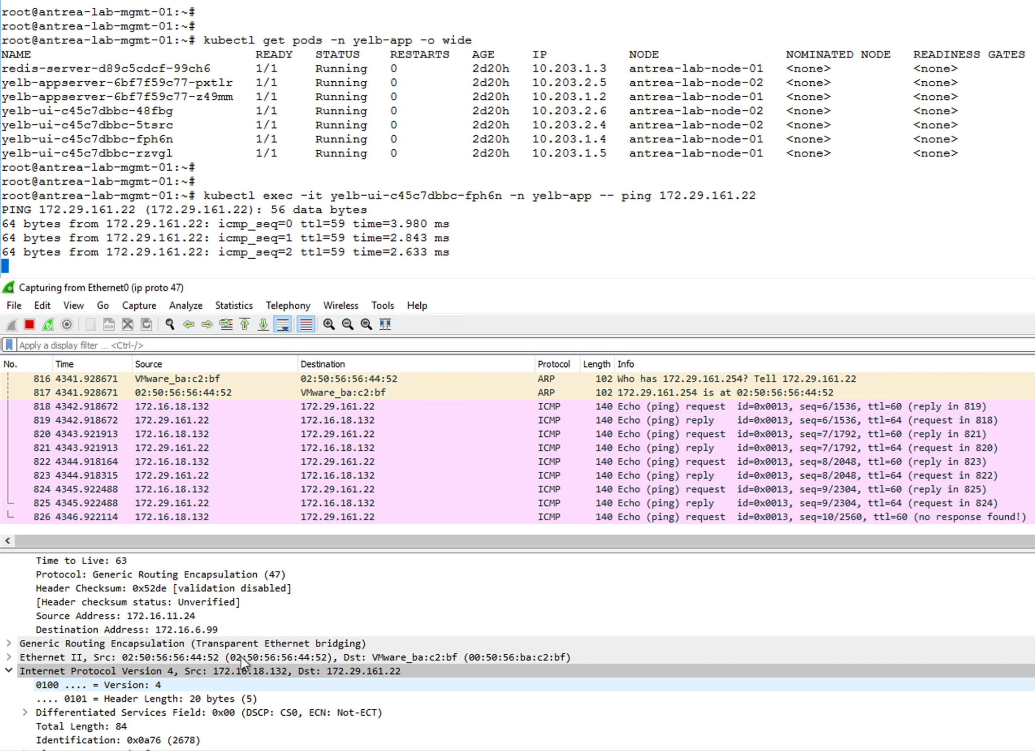 然後,換一個Namespace。在yelb-app namespace內,位於node-01上的pod yelb-ui-c45c7dbbc-fph6n,IP是10.203.1.4。從這個Pod去ping 172.29.161.22,在Wireshark看到網路流來源改變了,是來自172.16.18.132,如圖5所示。