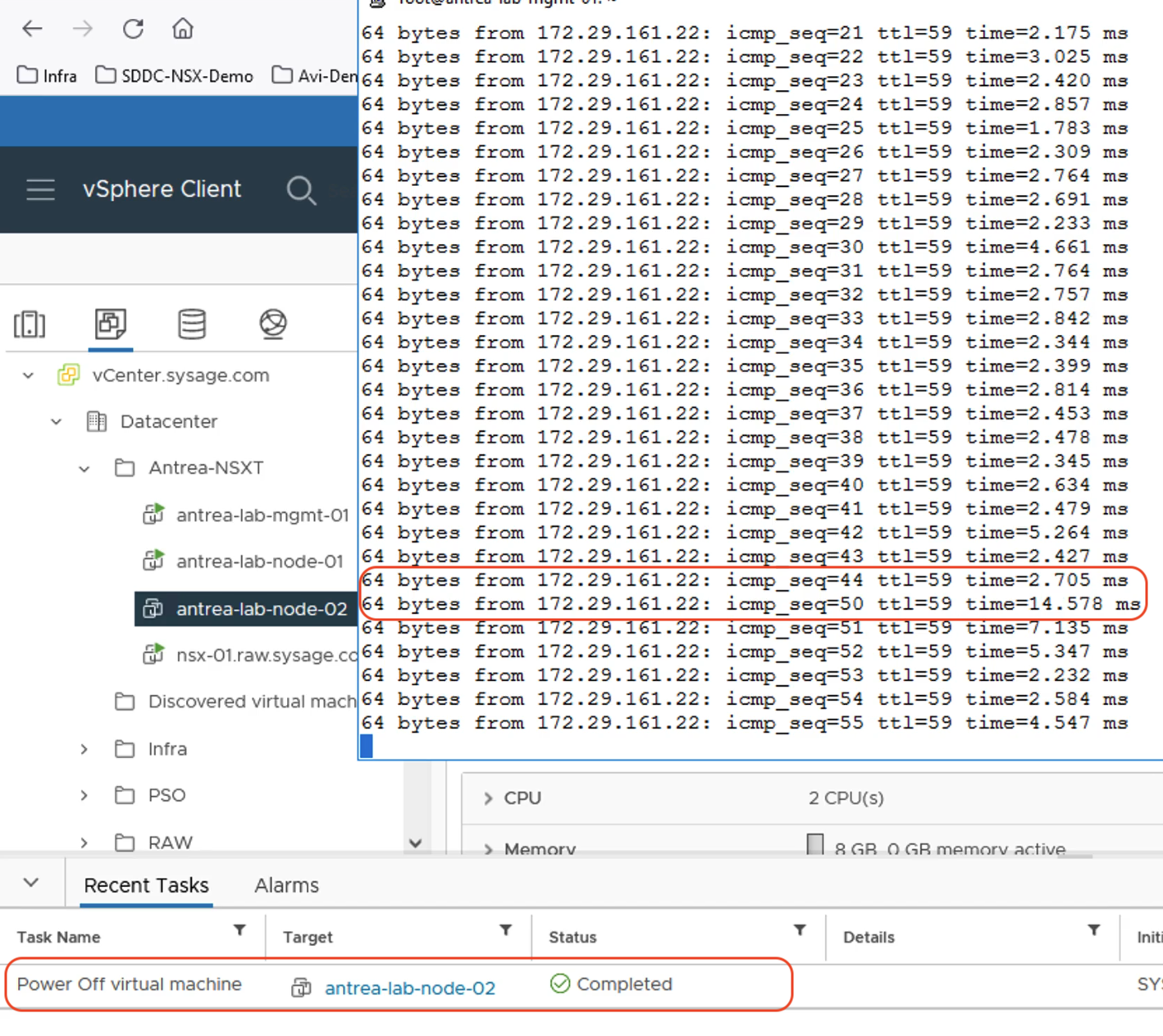 圖8是一個簡單的測試,從圖7的10.203.1.4這個Pod持續地ping外部的172.29.161.22,然後手動直接把Node 2的虛機用Power-off的方式強制關掉。圖8內可以看到,中間掉了6個ping,但就自動恢復了。不是非常完美的無感移轉,但是也算是秒級恢復了。