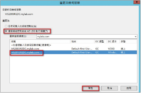 接著,點取「這個網域控制站或AD LDS執行個體」選項,並點選下面方框內的Windows Server 2012 R2網域控制站,再按下〔確定〕按鈕,如圖24所示。