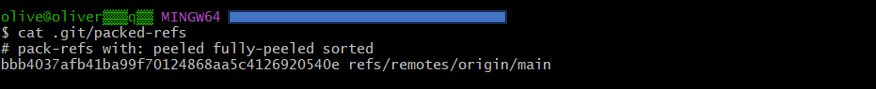 packed-refs是Git為了節省空間、加快讀取速度而產生的一個索引檔案。平常Git會把每個分支、標籤等資訊分別放在.git/refs/裡的各種小檔案中,然而當專案規模變大、變多時,這些分散的小檔案會讓存取效率下降。為了解決這個問題,Git會在需要時把這些零散的refs打包成單一的packed-refs檔案,讓所有指標集中存放在同一個地方,這麼一來,Git只需要讀取一個檔案就能取得所有refs資訊,大幅加快查詢速度,packed-refs使用範例如圖14所示。