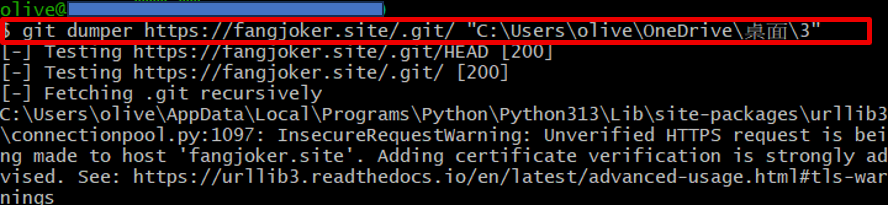 阿範先在桌面建立一個資料夾用來存放等一下抓到的資料,利用指令「pip install git-dumper」安裝好git-dumper工具和相關套件,接著輸入「git-dumper https://fangjoker.site/.git/ "C:\Users\olive\OneDrive\Desktop\3 "」。
