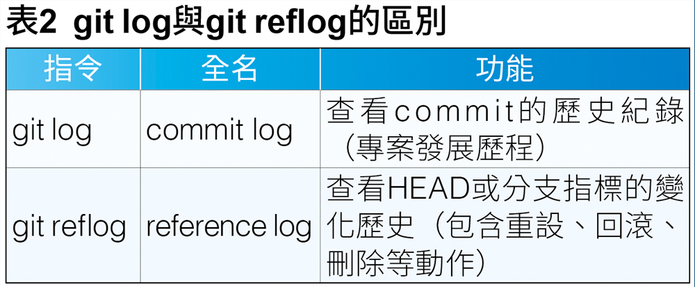 亦即歷史紀錄。在進行專案時,開發者會根據不同情況的要求,來切換各種分支做各種不同工作的切換,以利進行版本控制。因此.git/logs/便顯得格外重要保存,因為它會保存在這個專案分支的歷史紀錄和各個各種HEAD。因為它能記錄每一次的commit、分支切換、merge或reset的操作,如圖4所示,對追蹤錯誤操作也非常有幫助。此外,與git log會相提並論的是git reflog,兩者差異整理如表2所示。