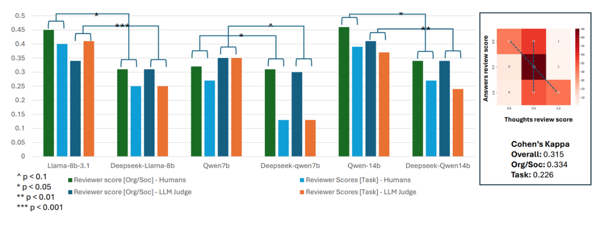 圖2 呈現人類評審與大型語言模型即評審(LLM-as-a-Judge)針對任務與組織社會(Org-Soc)相關問題的回答評分。非推理模型的評分表現優於具備推理能力的模型(如DeepSeek)。此外,思維評分與回答評分之間的相關性較弱。