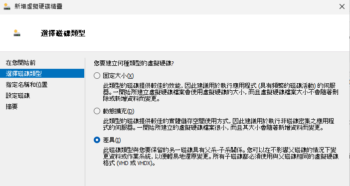 在Hyper-V的虛擬硬碟類型中,有「固定大小」和「動態擴充」兩種可供選擇。前者提供最佳的運行效能,不過在一開始建立時便會根據所設定的大小直接占用儲存空間;後者則提供最佳的實體儲存空間,也就是虛擬硬碟的檔案大小,會隨著新增的資料逐漸增長。