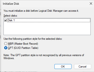 完成新磁碟的上線設定後,緊接著繼續在該磁碟上方按下滑鼠右鍵並點選選單中的【Initialize Disk】。開啟初始化磁碟設定頁面後,如圖4所示,在此選取「GPT」分割區樣式,主要是因為相較於傳統的MBR樣式,GPT除了支援2TB以上的磁碟容量外,還支援可建立高達128個分割區,最後按下〔OK〕按鈕。