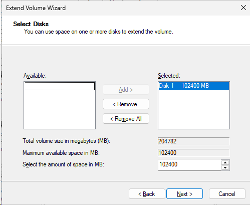 完成新增虛擬硬碟後,接下來啟動此虛擬機器並進入到Guest OS中。進入Windows客體作業系統後,開啟磁碟管理(Disk Management)介面,在新的磁區上方按下滑鼠右鍵,然後點選快速選單中的【Extend Volume】繼續。如圖5所示,在「Select Disks」頁面中便可以將新增加的磁碟可用空間加入至右邊的窗格中,按下〔Next〕按鈕完成設定即可。