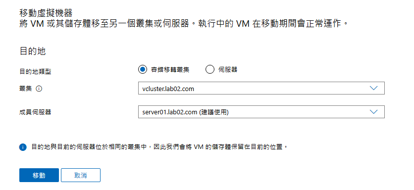 這裡以執行「移動」虛擬機器為例,執行之後將會開啟如圖3所示的頁面,只須確認已選擇「容錯移轉叢集」目的地類型,便可以再完成叢集與成員伺服器的選取,然後按下〔移動〕按鈕即可。另外,若來源與目的地的伺服器是位於不同的叢集中,則在執行「移動」設定頁面中,還可以進一步決定是否要變更虛擬機器的儲存位置。