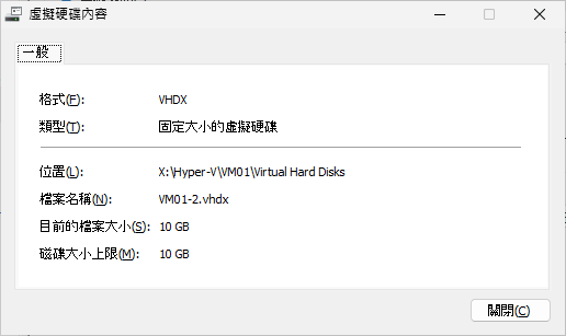 如何得知目前虛擬機器所使用的虛擬硬碟是哪一種類型呢?只要在虛擬機器的「設定」頁面中,對於選定的虛擬硬碟頁面按下〔檢查〕按鈕,即可開啟「虛擬硬碟內容」頁面,如圖6所示,便能夠查看到範例中的虛擬硬碟類型屬於「固定大小的虛擬硬碟」。