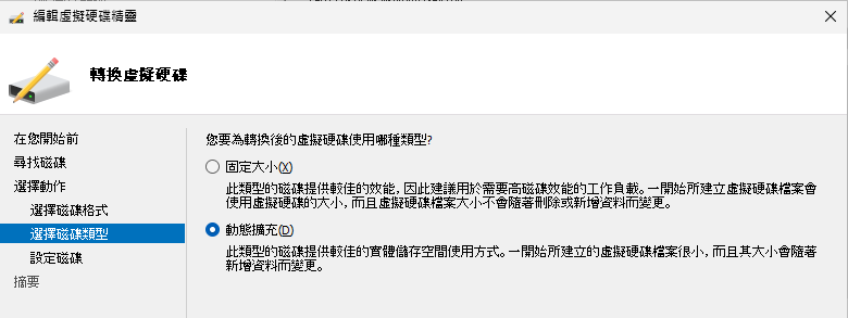 隨後,在「選擇磁碟格式」頁面中選取「VHDX」,主要是此格式支援最大64TB的虛擬硬碟大小,但必須注意的是,Windows Server 2012以前的作業系統不支援此虛擬硬碟格式。來到「選擇磁碟類型」頁面後,如圖7所示,便可選擇想要轉換的虛擬硬碟類型,選取「動態擴充」。