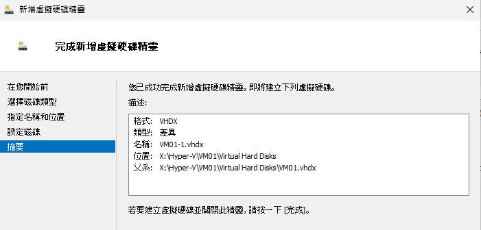 如圖10所示,在「摘要」頁面中,確認子虛擬硬碟與父虛擬硬碟的檔案名稱和路徑,若正確無誤便按下〔完成〕按鈕。