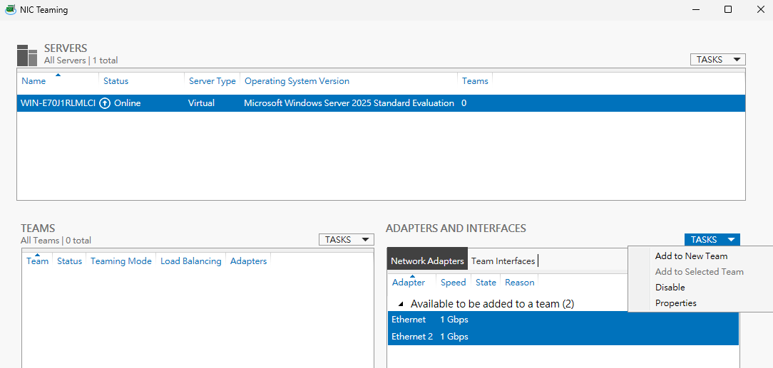 接下來,就可以啟動客體作業系統,這裡以英文版本的Windows Server 2025為例做示範。在「Server Manager」介面的「Local Server」頁面中,點選「NIC Teaming」的「Disabled」連結。開啟如圖14所示的頁面後,在「ADAPTERS AND INTERFACES」區域中,先連續選取所要建立NIC小組的網路介面,再點選「TASKS」下拉選單中的【Add to New Team】。