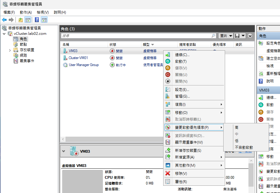 前面示範了如何在獨立的Hyper-V主機中設定虛擬機器自動啟動與自動關機的功能,但是如果虛擬機器是在容錯移轉叢集的架構中運行,那麼「自動啟動動作」設定將會變成「不執行任何動作」,這是因為主導權已經改由叢集服務來決定,此時必須透過「容錯移轉叢集管理員」介面,如圖13所示選擇【變更啟動優先順序】中的高、中、低或是不自動啟動。