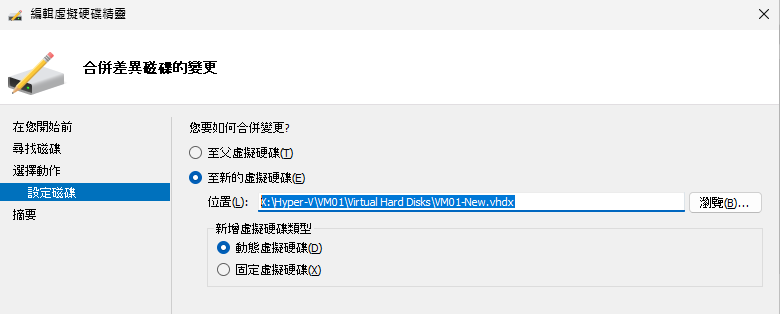 當確認完成子虛擬硬碟中所有要執行的異動任務後,如果需要合併於上層的父虛擬硬碟,先將此Guest OS正常關機,接著開啟此虛擬機器的「設定」頁面,並按下此虛擬硬碟的〔設定〕按鈕,以便開啟「選擇動作」頁面,在此選取「合併」並按下〔下一步〕按鈕。