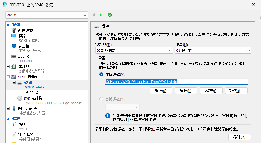 在「摘要」頁面中,確認上述設定皆無誤後按下〔完成〕按鈕。完成虛擬硬碟的合併作業後,務必在此虛擬機器的「設定」中,如圖12所示,將虛擬硬碟設定修改成合併後的虛擬硬碟檔案。最後,啟動此虛擬機器,再檢查Guest OS中的所有異動是否已在最新狀態即可。