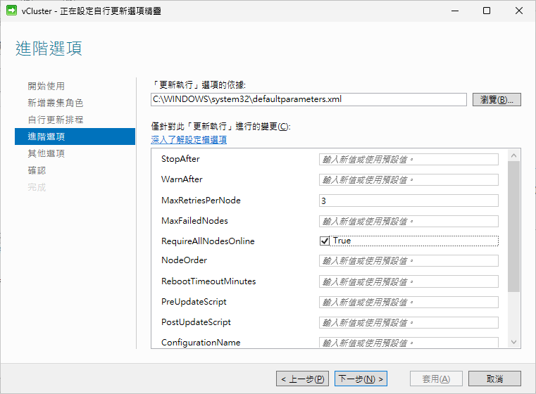 如圖16所示,在「進階選項」頁面中,若想要容錯移轉叢集下的所有伺服器節點,皆必須在線上狀態時才可以進行Windows Update作業,那麼在此就必須勾選「RequireAllNodesOnline」選項。至於其他常用的選項設定,還有「MaxFailedNodes」以及「MaxRetriesPerNode」。