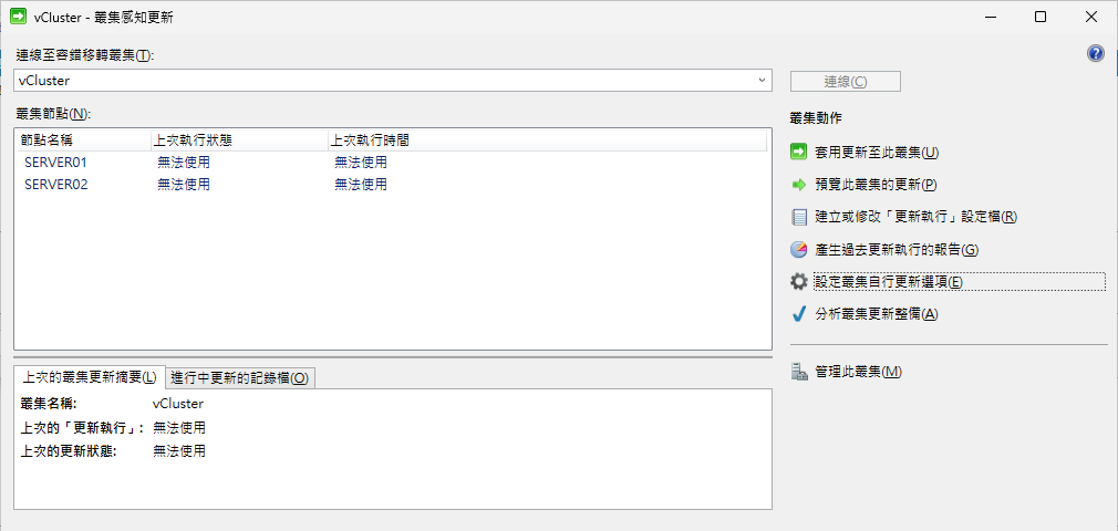 首先,從「伺服器管理員」介面的「工具」選單中,點選「叢集感知更新」。接著,在「連線至容錯移轉叢集」欄位中輸入所要連線的容錯移轉叢集的名稱。確認成功連線後,點選「設定叢集自行更新選項」,如圖15所示。
