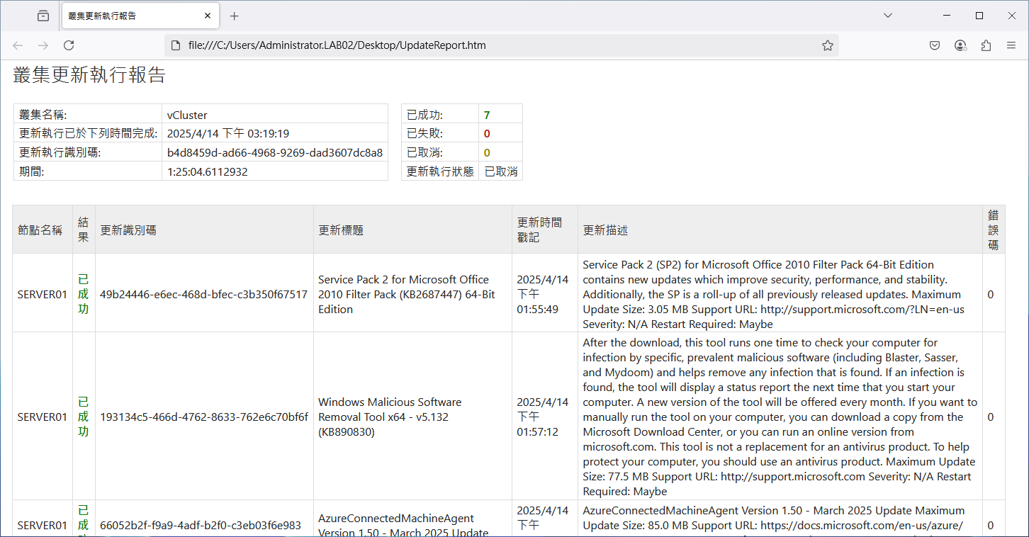 如果想要更進一步知道所更新的項目解決了哪一些Bug或是安全性方面的問題,只要點選「產生過去更新執行的報告」。緊接著,根據選擇的日期區間與更新選項按下〔產生報告〕按鈕匯出報告。圖17所示便是一個典型的更新執行報告範例,在此可以查看到每一個伺服器節點成功更新的結果、更新標題、更新時間以及更新描述。