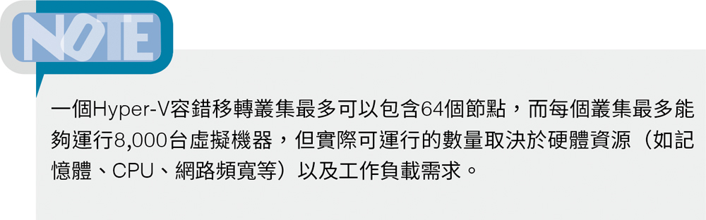 ‧Hyper-V管理員:這是Windows Server所內建的MMC視窗管理工具之一,主要用於單台或多台獨立伺服器的管理,例如建立、設定、移動以及監視虛擬機的運行狀態,但不適用於管理多台Hyper-V伺服器的叢集環境。