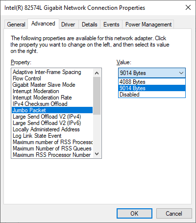 接下來,建議進一步開啟網路連線屬性中的「Advanced」頁面,並且如圖6所示將其中的「Jumbo Packet」設定值修改為「9014 Bytes」。會修改這一項設定主要是因為每一個網路封包(Packet)都會有表頭和表尾,當啟用網卡的Jumbo Packet功能後,它所能夠承載的資料將可以更多,因此會減少網路堆疊的負載,進而增加網路流量的處理速度。此外,也由於網路堆疊呼叫量減少了,相對地讓CPU使用率大幅下降。