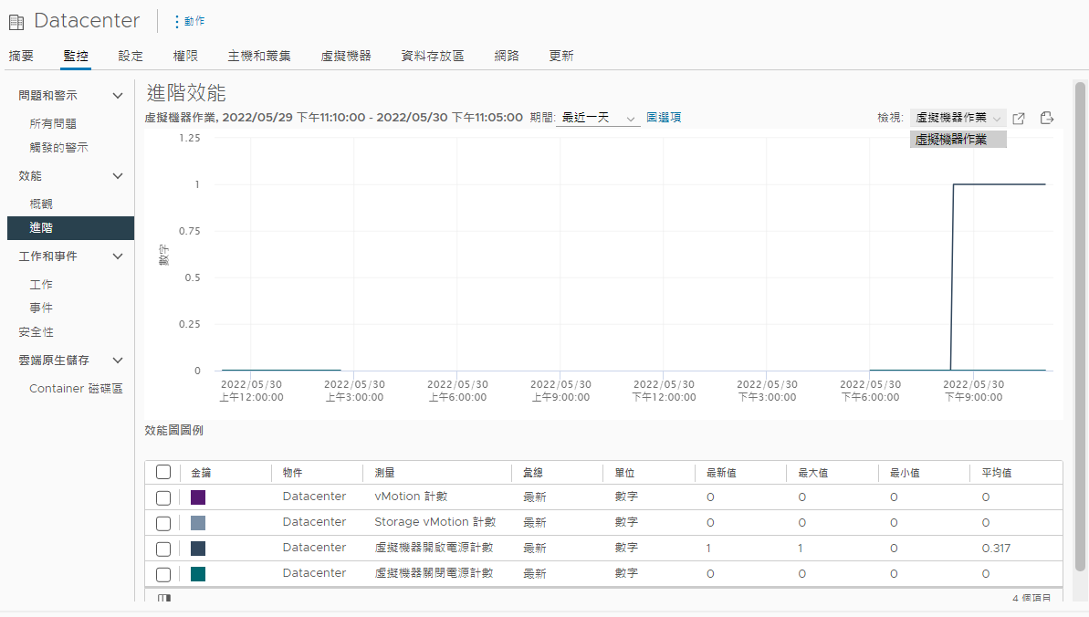 如圖2所示,在資料中心的「進階效能」頁面中,預設將可以查看到「虛擬機器作業」的相關效能計數器數據圖表,包括vMotion計數、Storage vMotion計數、虛擬機器開啟電源計數,以及虛擬機器關閉電源計數等等。如果想要自訂進階效能的數據統計圖表,則點選「圖選項」超連結。