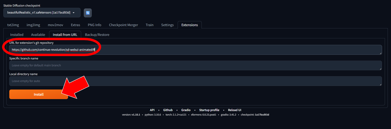 然後,在URL欄輸入「https://github.com/continue-revolution/sd-webui-animatediff」,並按下Install。等待安裝完成後,按Apply and restart UI(套用並重啟)。重新啟動WebUI後,介面會自動更新並出現AnimateDiff面板,通常會出現在txt2img與img2img的欄位內(圖7)。