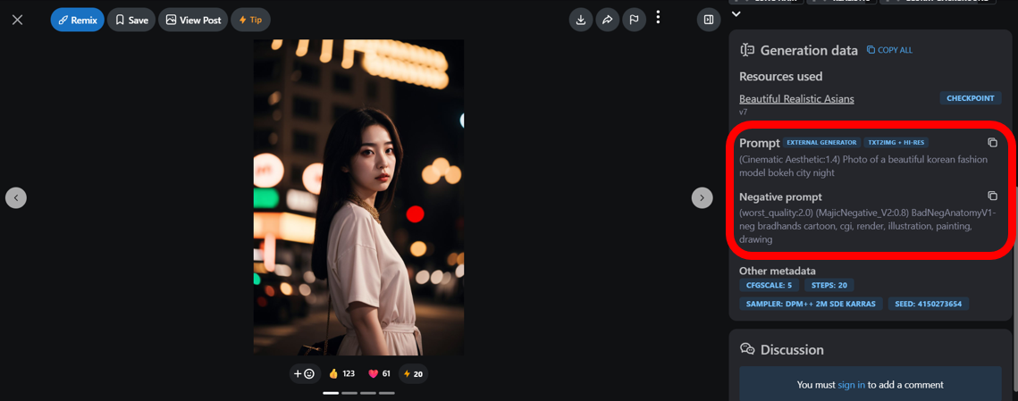 此時,就可開始進行影片的生成。首先,在Prompt欄位內輸入想要呈現的畫面及動作,可輸入想要呈現或加強的細節,例如細緻的臉部(Detailed Face)。接著,在Negavite Prompt欄位內輸入不想出現在畫面中的元素,例如多餘的眼睛(Extra Eyes)。若是像小周這樣第一次接觸AI生成影片的初學者,可以下載其他作者已訓練完成的模型檔,並從Civitai網站複製範例的Prompt(圖8)。