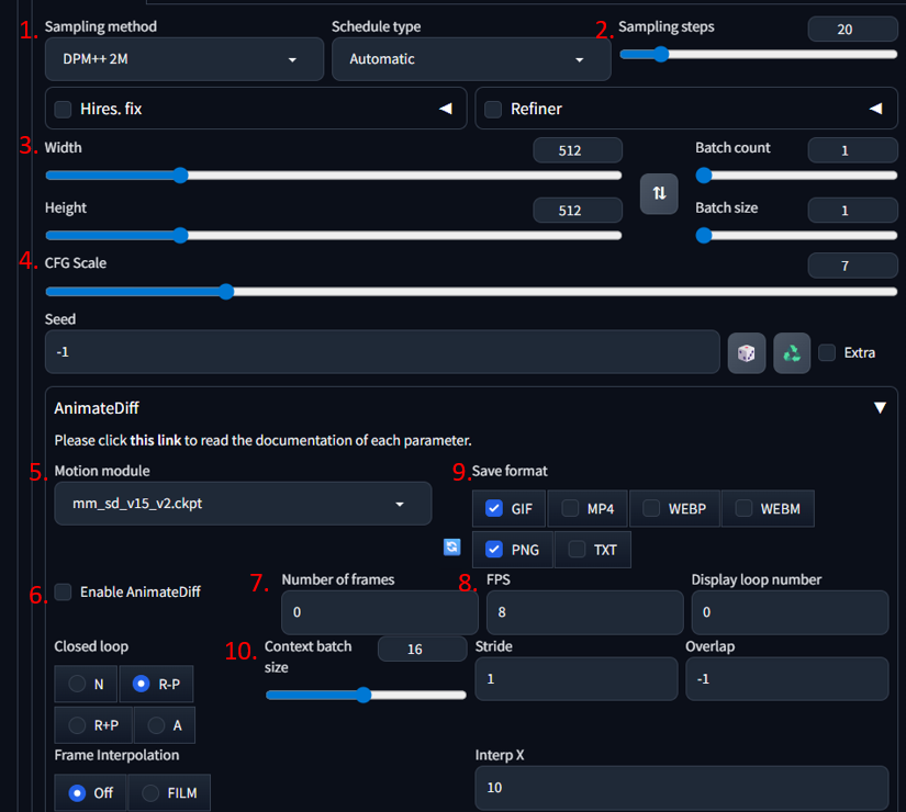 ‧Enable AnimateDiff(啟用動畫生成):打勾後才會使用AnimateDiff生成影片,而非靜態圖片。