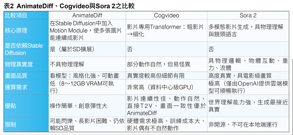 AnimateDiff、Cogvideo與Sora 2三者之比較,可參考表2的說明。