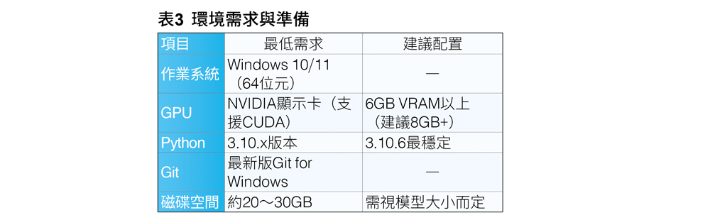 Stable Diffusion WebUI是目前最常用的介面,由Automatic1111維護。它讓使用者可透過網頁介面輸入Prompt生成圖片,並可安裝各種外掛以擴充功能,如ControlNet、AnimateDiff等。接著,以Windows平台為例,說明完整的安裝流程。相關的環境需求與準備,如表3所示。