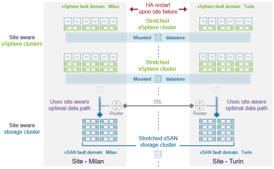 這項增強更新的運作核心,在於vSphere與vSAN大幅提升的「站台感知」(Site Awareness)能力,搭配「容錯網域」(Fault Domain)組態設定,能夠確保VM虛擬主機在不同站台之間的最佳化存取路徑,當其中一個站台發生災難事件時,受影響的VM虛擬主機便能自動在另一個站台上重新啟動,維持關鍵營運服務不中斷。