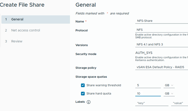 另外,在vCenter管理介面中,依序點選「Cluster > Configure > vSAN > File Shares > ADD」,在彈出的Create File Share視窗中,在1. General頁面內,依據實際需求填入下列欄位,如圖6所示:
