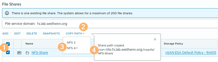 每個vSAN叢集中的vSAN檔案服務,最多支援500個檔案分享,如圖2所示,這樣的數量足以滿足大多數情境需求,無論是Linux或Windows運作環境的需求,以及需要NFS-based Persistent Volumes機制,提供持續性儲存的雲端原生工作負載環境。值得注意的是,SMB分享機制仍存在最多100個SMB分享的上限。