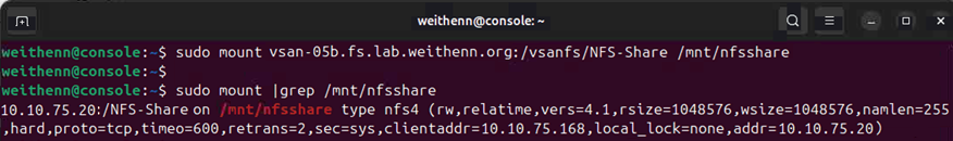 切換到Linux主機後,執行「sudo mount」指令搭配NFS檔案共用路徑和本機掛載點,例如「sudo mount vsan-05b.fs.lab.weithenn.org:/vsanfs/NFS-Share /mnt/nfsshare」。掛載完成後,執行「sudo mount | grep /mnt/nfsshare」指令,檢查Linux主機的掛載系統是否已經存在NFS檔案共用路徑,如圖10所示。