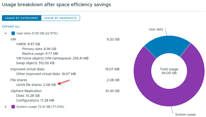 圖18 查看vSAN檔案服務在vSAN叢集中整體占用的儲存空間。
