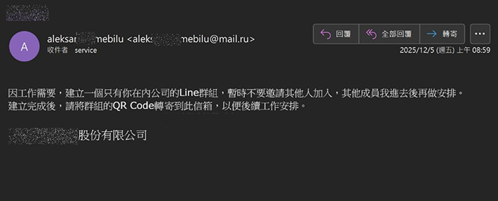 1. 跨平台引流詐騙:攻擊者多半利用Gmail、mail.ru、AOL、Hotmail、Yahoo等免費信箱寄送郵件。郵件僅作為誘餌,郵件中不含惡意連結或附件,因此不易被資安防護設備檢出,目的是將受害者都引導至封閉的LINE群組,後續的社交工程攻擊對象皆瞄準群組內的財務人員(圖3)。此類詐騙發送者經常偽裝成公開可查的企業負責人、高階主管,藉此提高信任感與威權壓力。