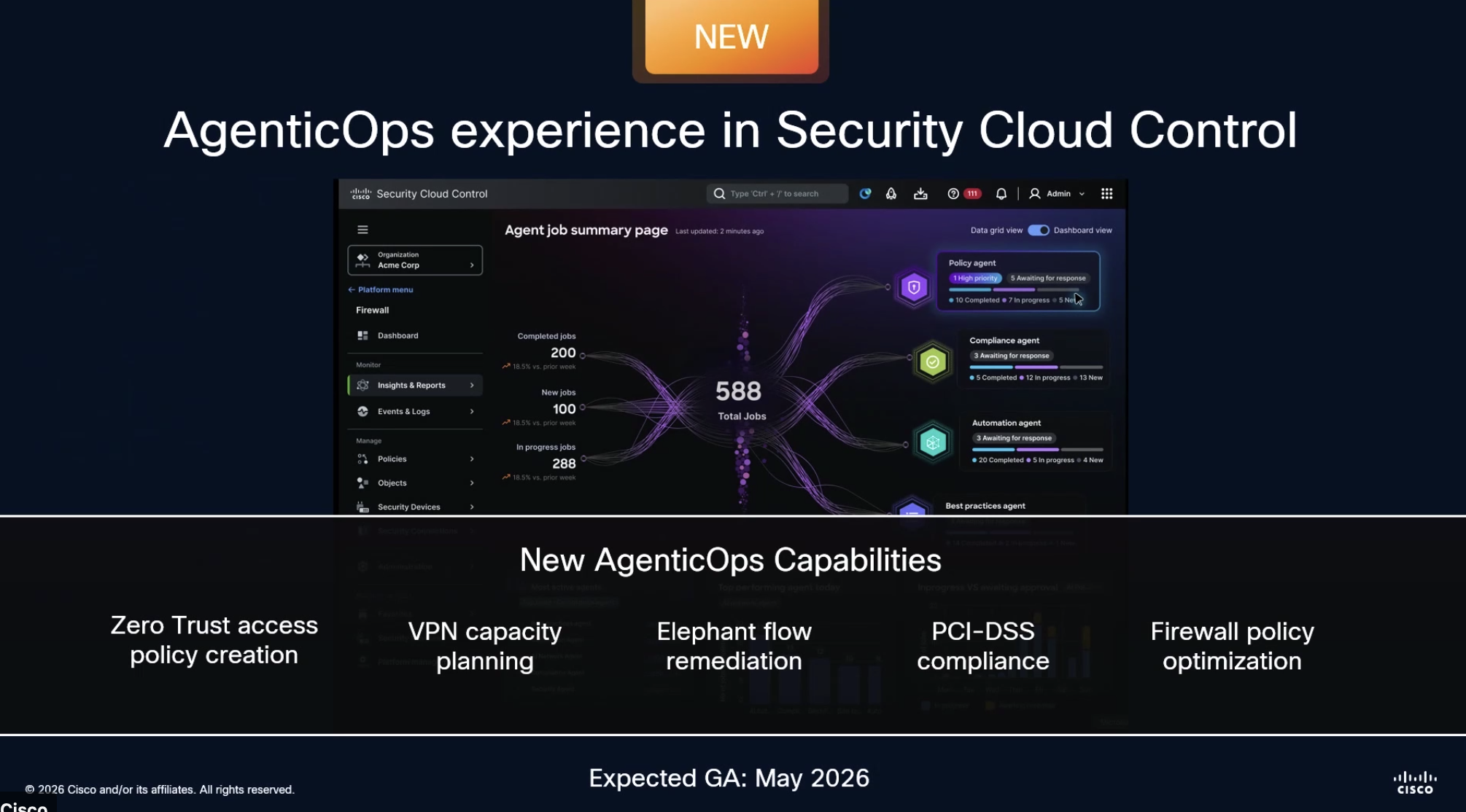 Security Cloud Control納入AgenticOps能力,整合零信任政策建立、VPN規劃、流量壅塞處置、PCI DSS合規檢核與防火牆政策最佳化,強化自動化能力。(資料來源:Cisco)